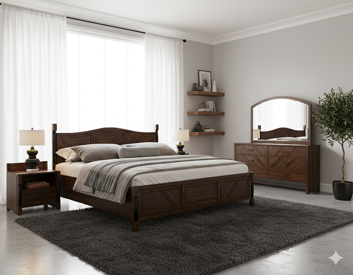 This bedroom set combines traditional durability with a sophisticated, transitional design. Constructed entirely from high-quality solid wood with a rich, dark walnut finish, the set is designed to be the centerpiece of a warm and inviting bedroom.