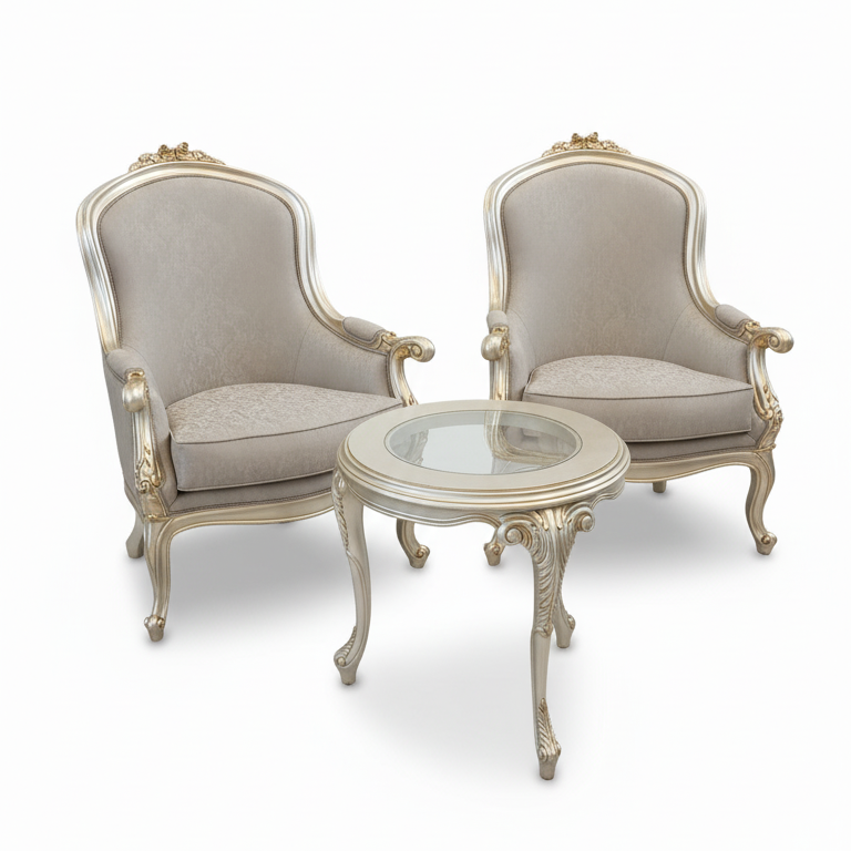 Inject timeless sophistication into your home with this stunning French-inspired coffee set. Featuring two elegant armchairs and a coordinating coffee table, the entire wooden structure is finished in a beautiful distressed silver-leaf lacquer, offering a lighter, more delicate alternative to traditional dark wood. The chairs feature a gracefully curved frame and are upholstered in a neutral, high-quality fabric, likely a light taupe or pale champagne, with subtle patterned detailing on the seat cushion. The flowing lines and carved accents on the legs and crest rail capture the essence of Rococo styling. The centerpiece is the matching coffee table, which boasts a clear glass tabletop supported by beautifully curved and carved silver-leaf legs, providing a luxurious yet airy feel. This set is perfect for a refined sunroom, an elegant reception area, or a stylish dressing room. Chair