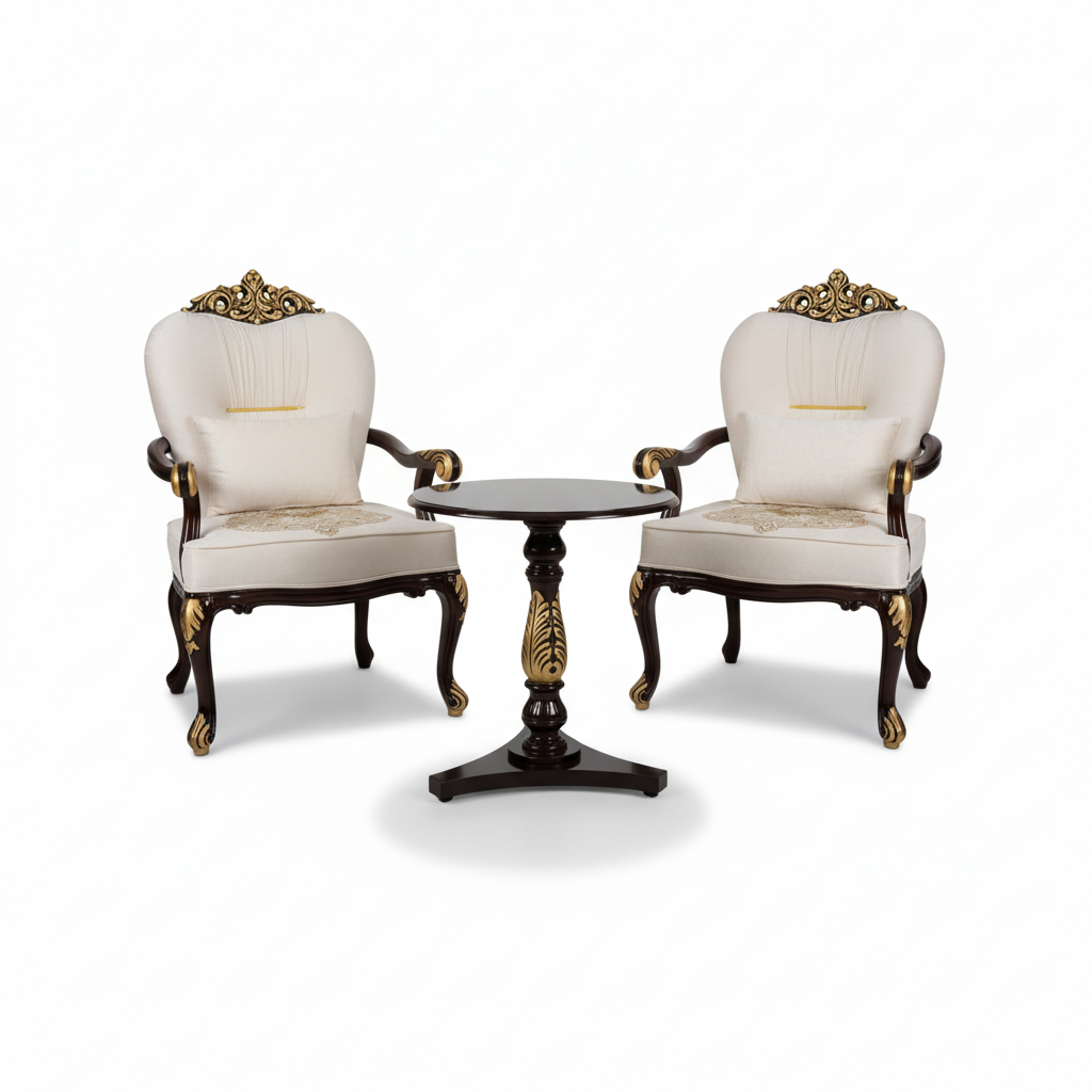 Experience luxury with this exquisite two-chair and center table set, designed to be a magnificent focal point in any premium interior. The deep mahogany-toned wood frame is meticulously detailed with stunning gold leaf applications on the crests, arms, and legs, adding a dramatic contrast and regal feel. The chairs are upholstered in a smooth, high-grade cream fabric, featuring elegant channeling or pleating on the backrest and subtle, embroidered detailing on the lower cushion. A matching lumbar pillow is included with each chair for enhanced comfort. The accompanying bistro table features a rich dark tabletop and a substantial, ornately carved pedestal base that perfectly mirrors the chairs’ luxurious gold and wood theme. This set is ideal for creating an intimate, high-end seating arrangement. Chair
