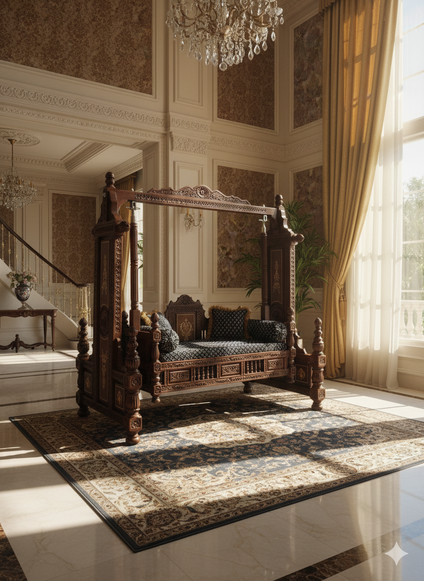 Hand-Carved Dark Teak Jula with Gold Inlay and Luxurious Seating