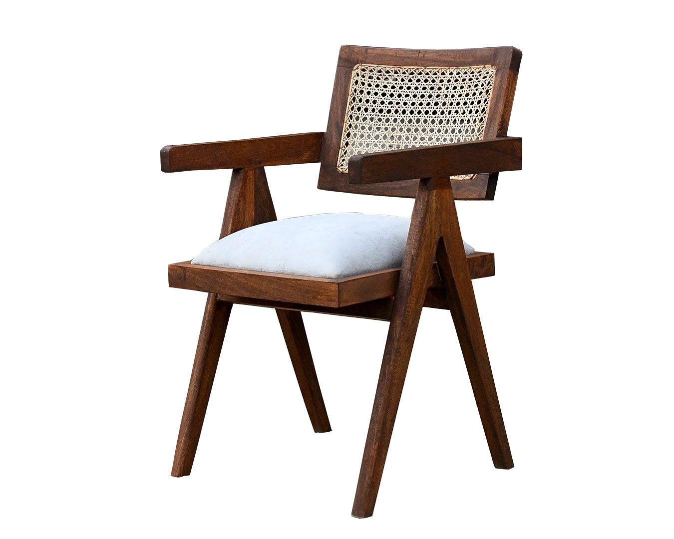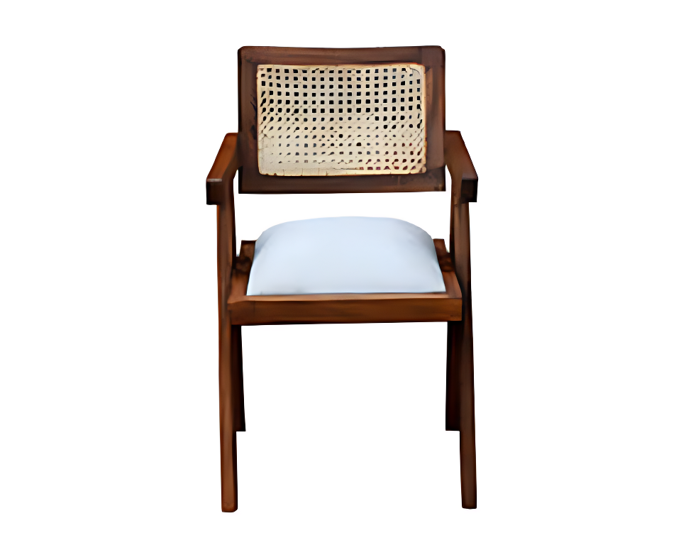 This striking chair draws inspiration from classic mid-century and minimalist design, featuring a geometric and structurally expressive frame. It is constructed entirely from solid hardwood, finished in a deep, rich brown stain that highlights the wood’s grain. The frame utilizes bold, angular lines, notably the pronounced A-frame support structure connecting the legs to the seat. The backrest is framed in solid wood and features an inset of tightly woven natural cane or rattan, which provides visual lightness and contrast to the dark frame. A simple, comfortable square cushion, shown here in light grey or off-white, rests on the solid wood seat base. This chair is perfect as a statement dining chair, a sophisticated office chair, or a refined accent piece in a modern interior.