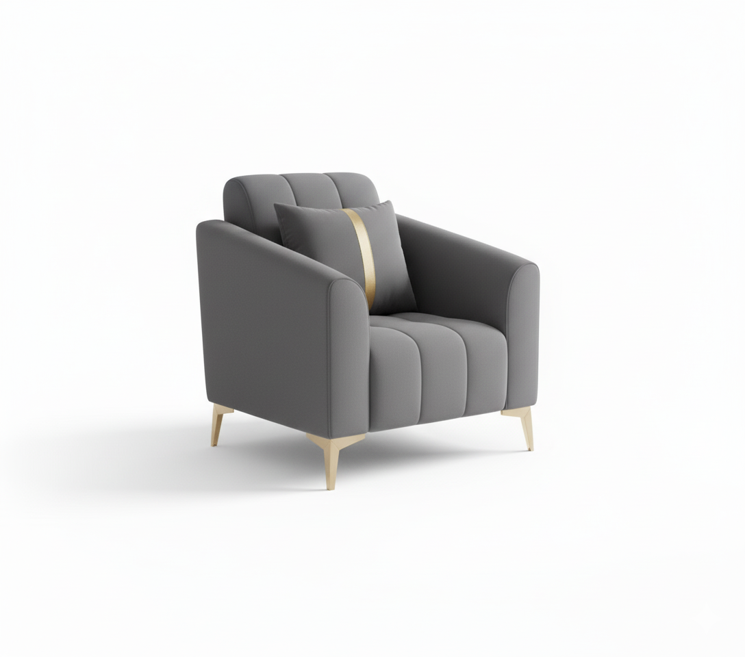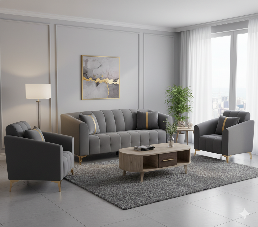 This elegant five-seater sofa set brings a sleek, cosmopolitan feel right into your living space. The set includes a spacious three-seater sofa and two comfortable single armchairs, perfect for hosting or simply enjoying a luxurious evening in. Upholstered in a soft, durable grey fabric, the pieces feature distinctive horizontal channel tufting across the backrest, which adds a refined texture and visual depth. A subtle, yet stylish, gold stripe accent runs across the included throw pillows, coordinating beautifully with the slender, angled wooden legs that are capped with a chic gold tone. This set balances clean lines with plush seating for a truly modern aesthetic. Sizes: The three-seater sofa measures 82 inches wide by 34 inches deep by 32 inches high. The single armchairs each measure 36 inches wide by 34 inches deep by 32 inches high.
