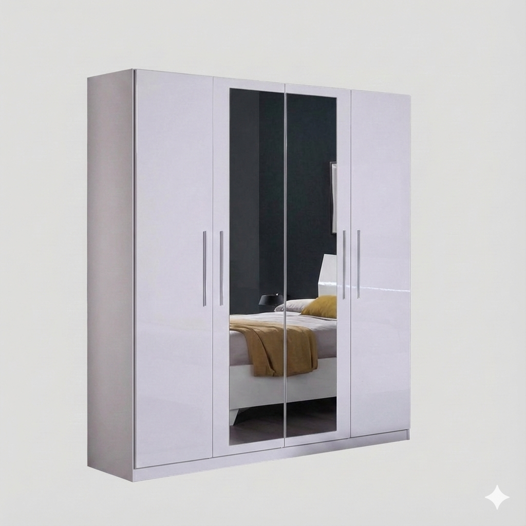 Modern High-Gloss White 4-Door Wardrobe with Double Mirrors