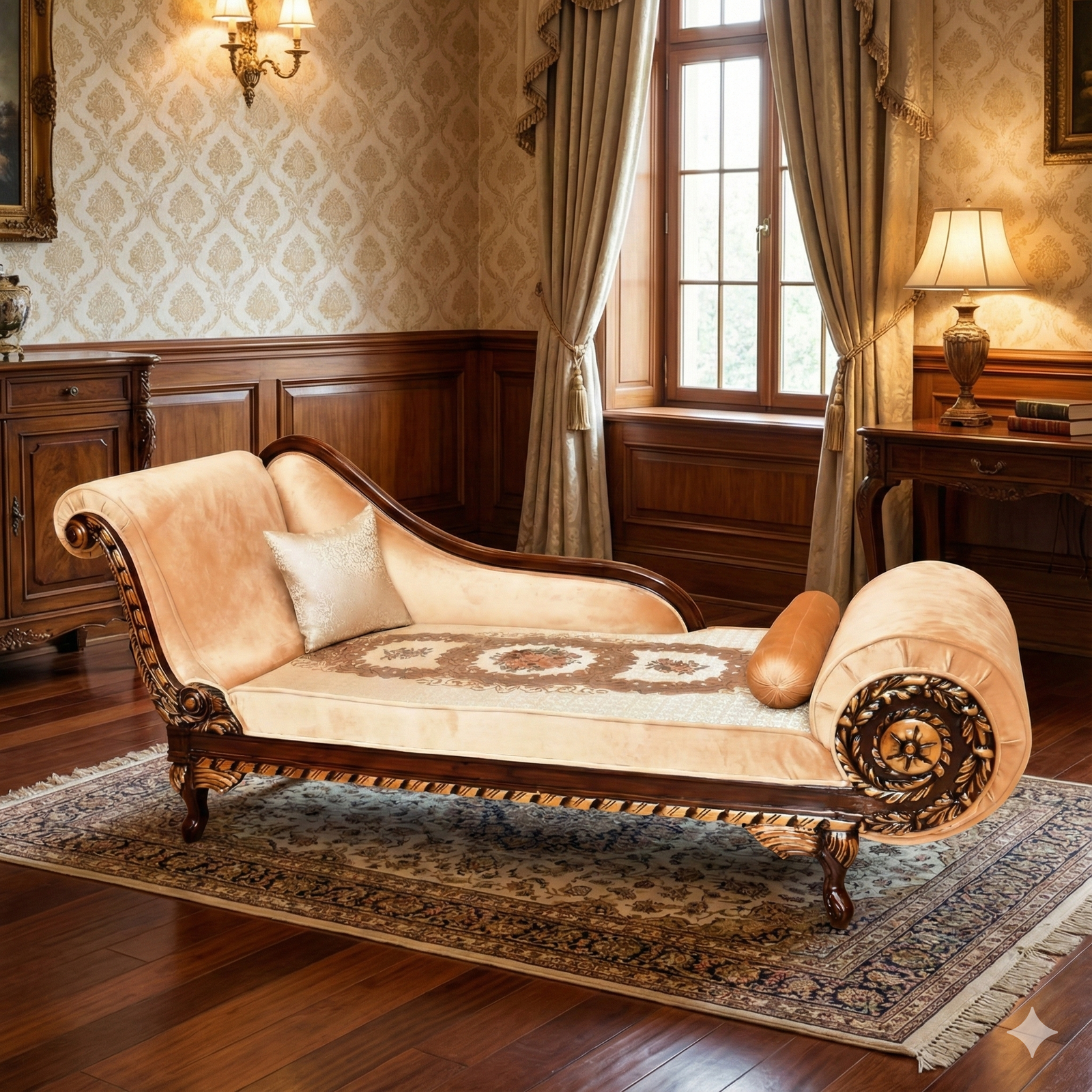 Premium Solid Wood Antique Dewan with Gold Accents & Floral Fabric