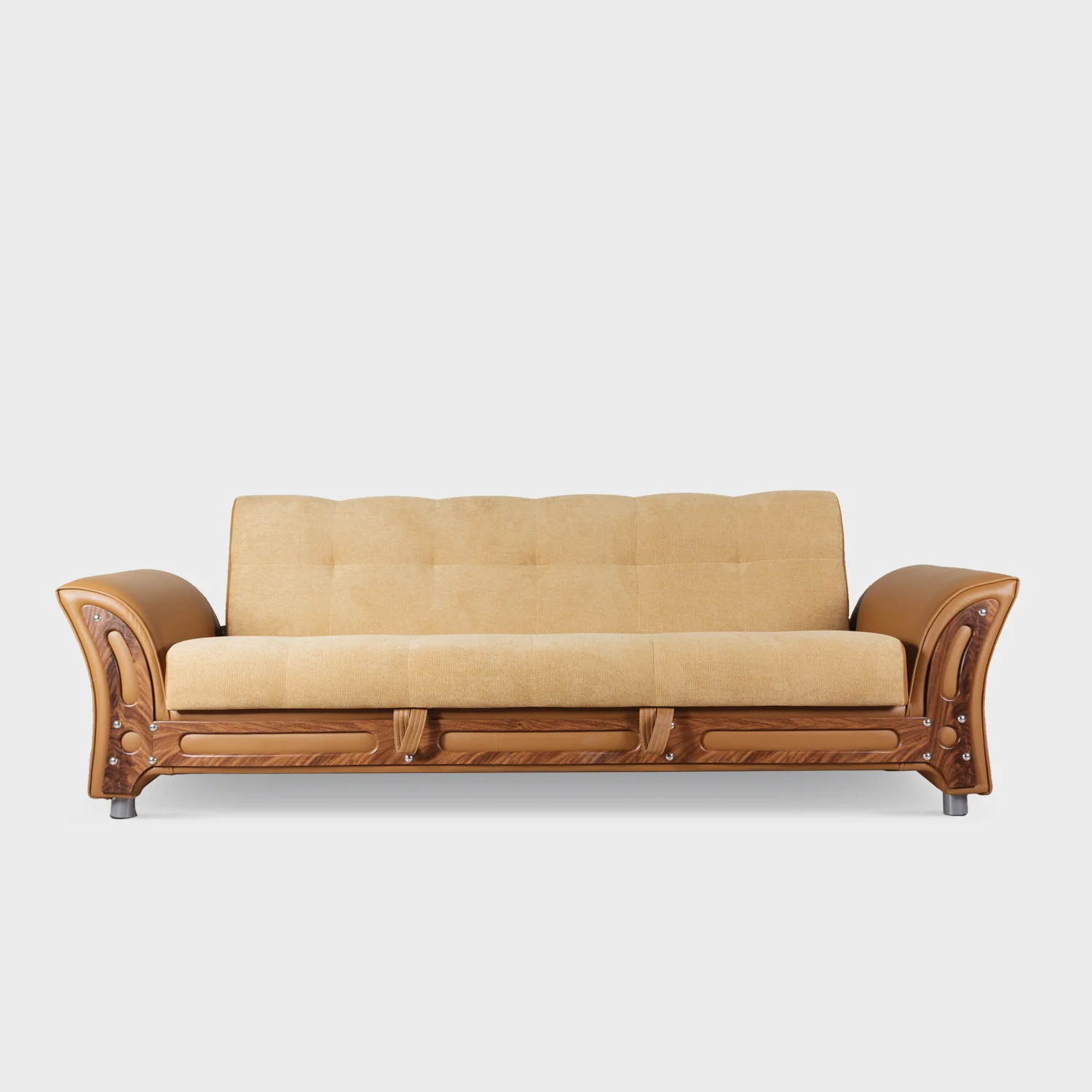 Luxurious Camel and Beige Dual-Tone Sofa Bed with Ornate Wood Trim