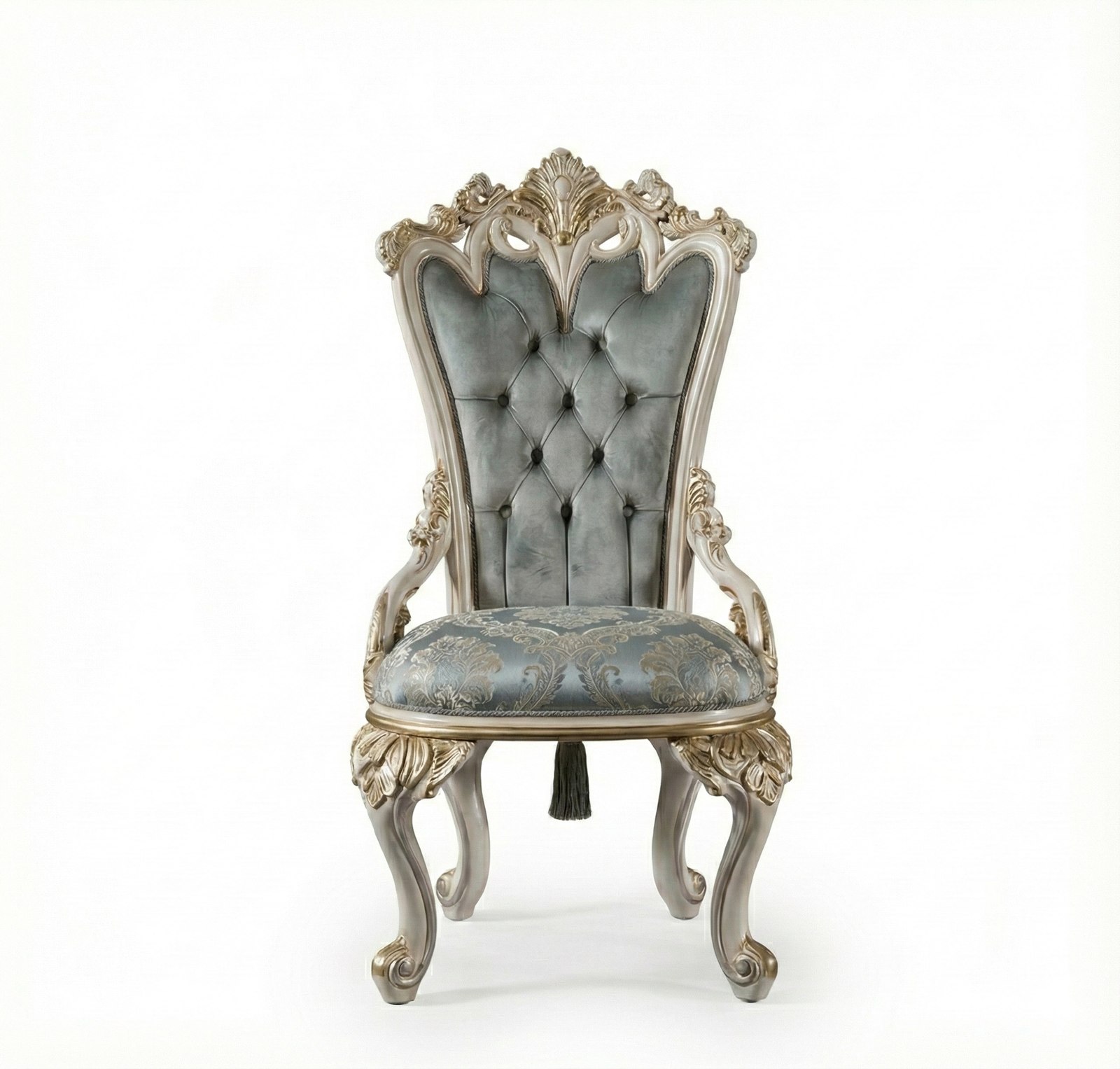 We haven’t cut any corners here. The wood features deep, intricate floral carvings highlighted in genuine antique gold, contrasting perfectly against the fresh white finish. The four chairs are upholstered in a sophisticated blend of tufted velvet and patterned damask fabric, giving you a seat that feels as expensive as it looks.