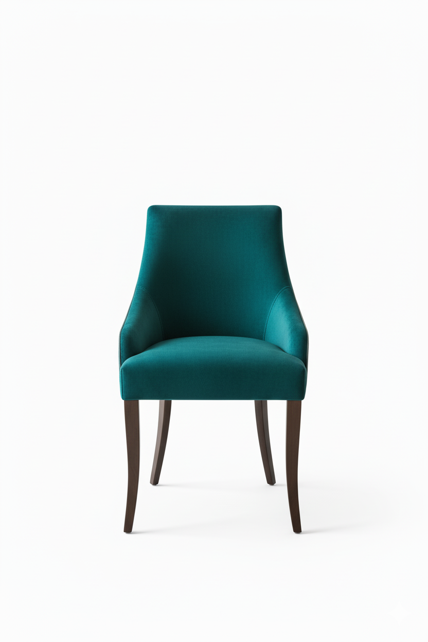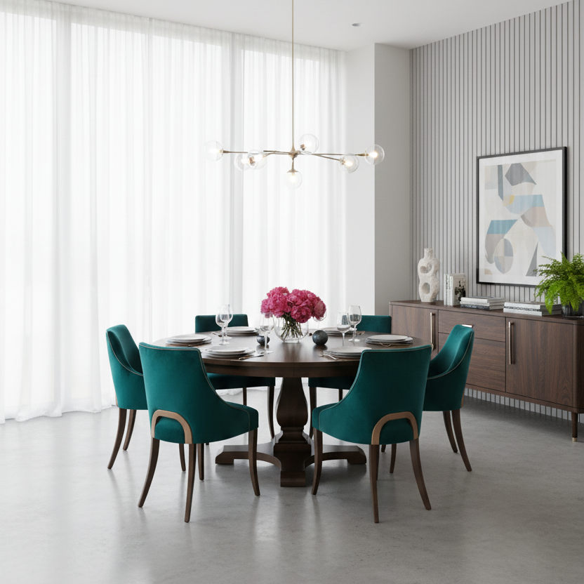 Traditional Dark Wood Extendable Round Dining Table with Sculptural Teal Velvet Chairs